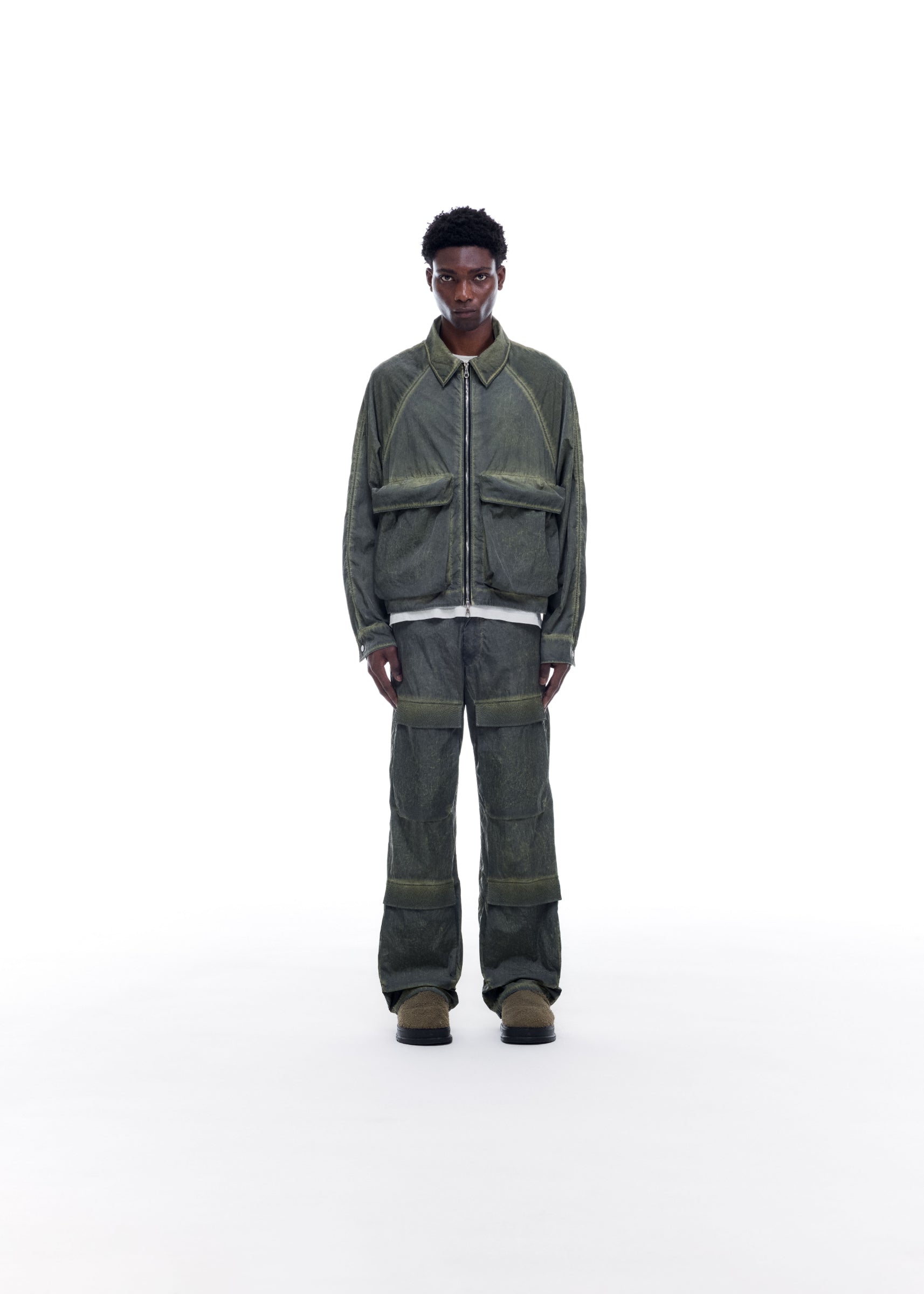 This overshirt has been cut from a lightweight nylon in an oversized cropped silhouette with raglan sleeves to slope the shoulders. The standout feature of this jacket is the two-way oversized cargo pockets on the front. We have dyed this garment with a cold wash technique to emphasise the detailing and finished it with a two-way CB branded zip.