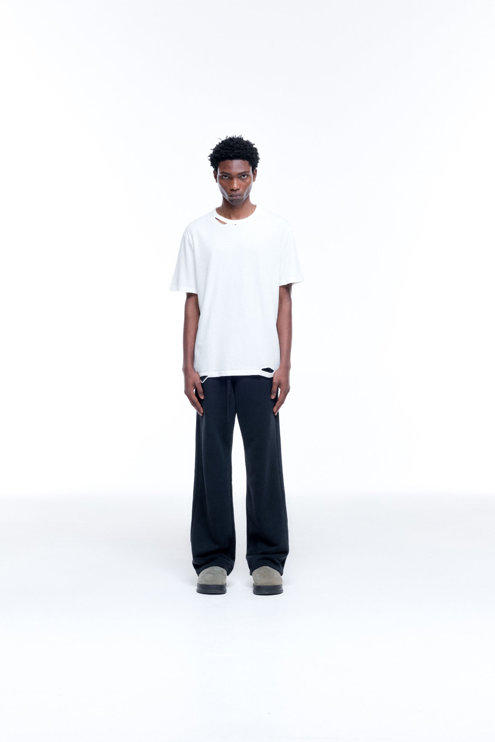 The Cole T-shirt is the newest offering in our t-shirt silhouettes. Cut in a more athletic shape from an open ended lightweight drapey cotton featuring a self fabric collar, coverstitched detailing throughout and a tonal classic embroidery on the back neck. We have subtly distressed this by hand to mimic vintage single jersey tshirts.
