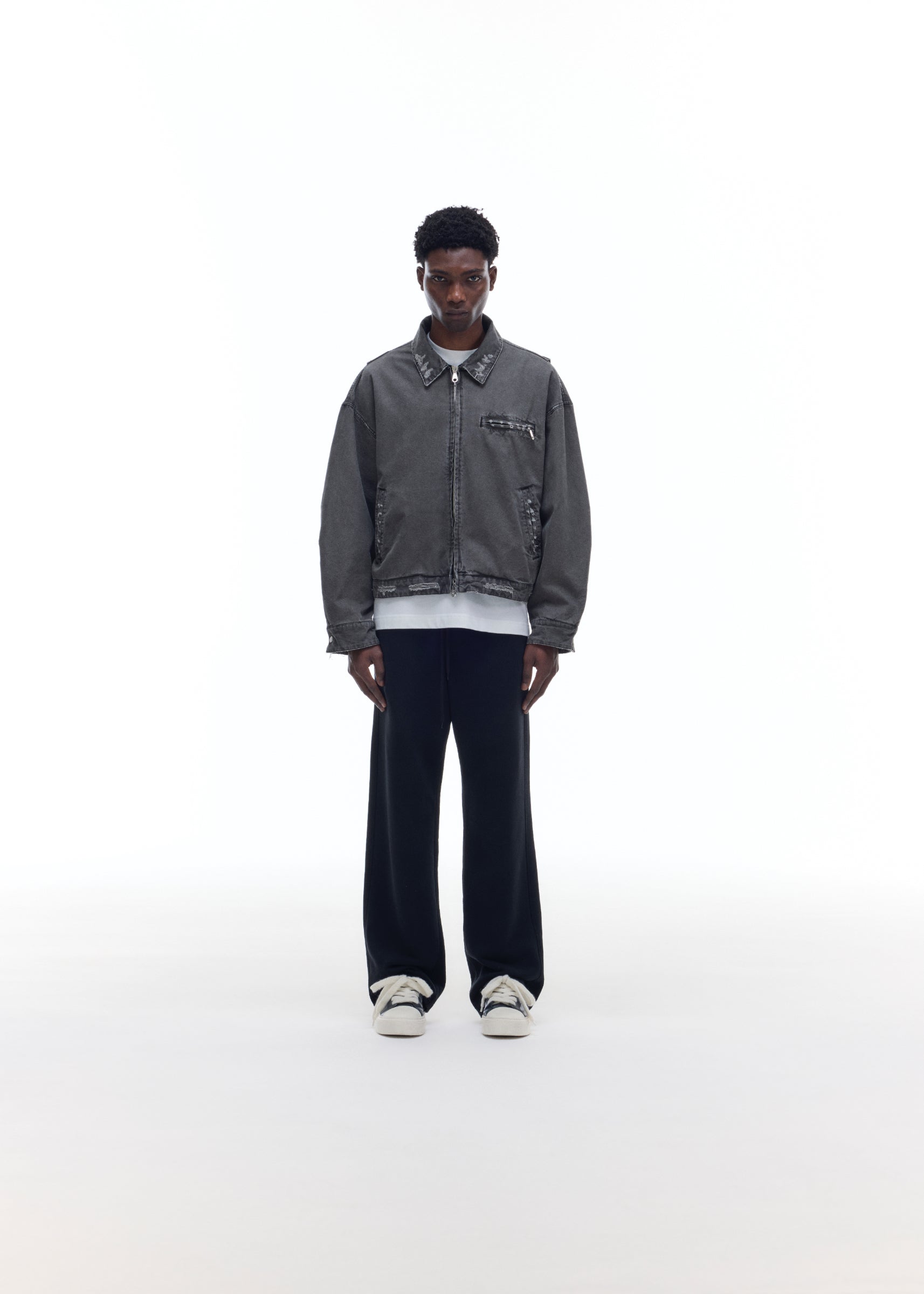 Our distressed trucker jacket is a blend of classic American workwear and contemporary menswear. Cut from a mid-weight garment-dyed cotton canvas in a boxy cropped silhouette featuring an oversized under-arm gusset. We have put zipped pockets at the front in typical Detroit style positioning , a silky viscose lining and finished with our signature 2-way CB branded zip. This garment has been meticulously distressed by hand so each piece is unique.