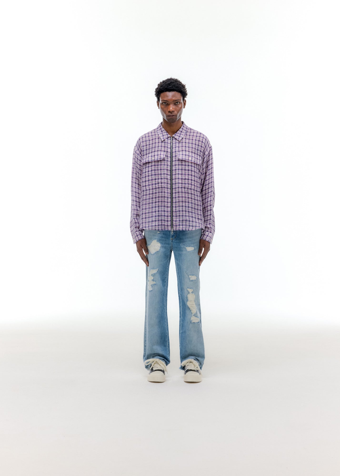 Brand new for SS25 is our zipped linen shirt. With design cues taken from classic Ivy League campus attire we’ve cut this shirt from an Irish linen check in a cropped and wide silhouette with dropped shoulders, a scalloped hemline and finished with 2 button down signature chest pockets and a CB branded 2way zip.