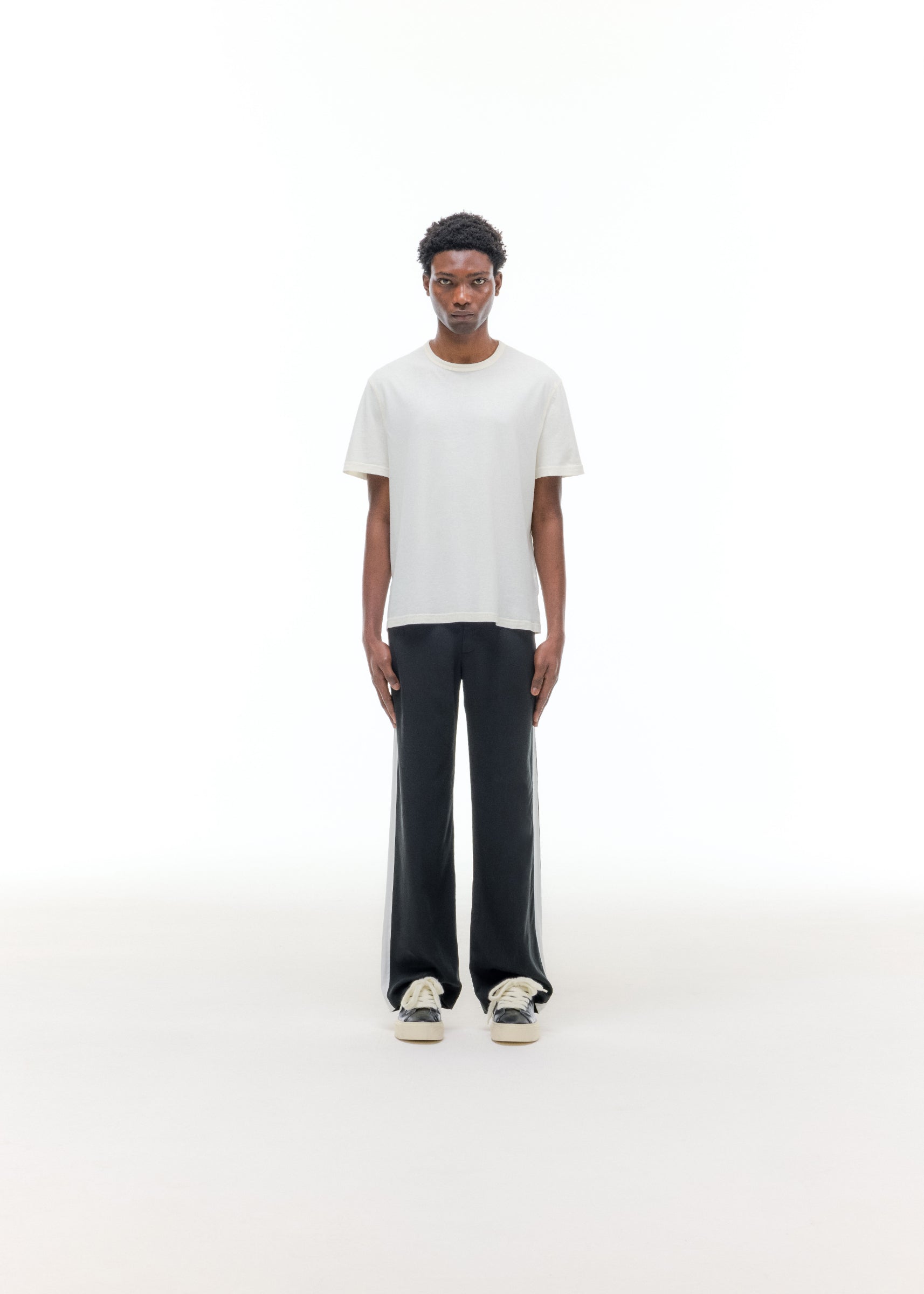 Cut from our drapey sand washed viscose /cupro in a baggy straight leg silhouette featuring a self fabric side panel on the outer leg in an off white . These tailored pants pair perfectly with Wilson’s and CB mules alike.