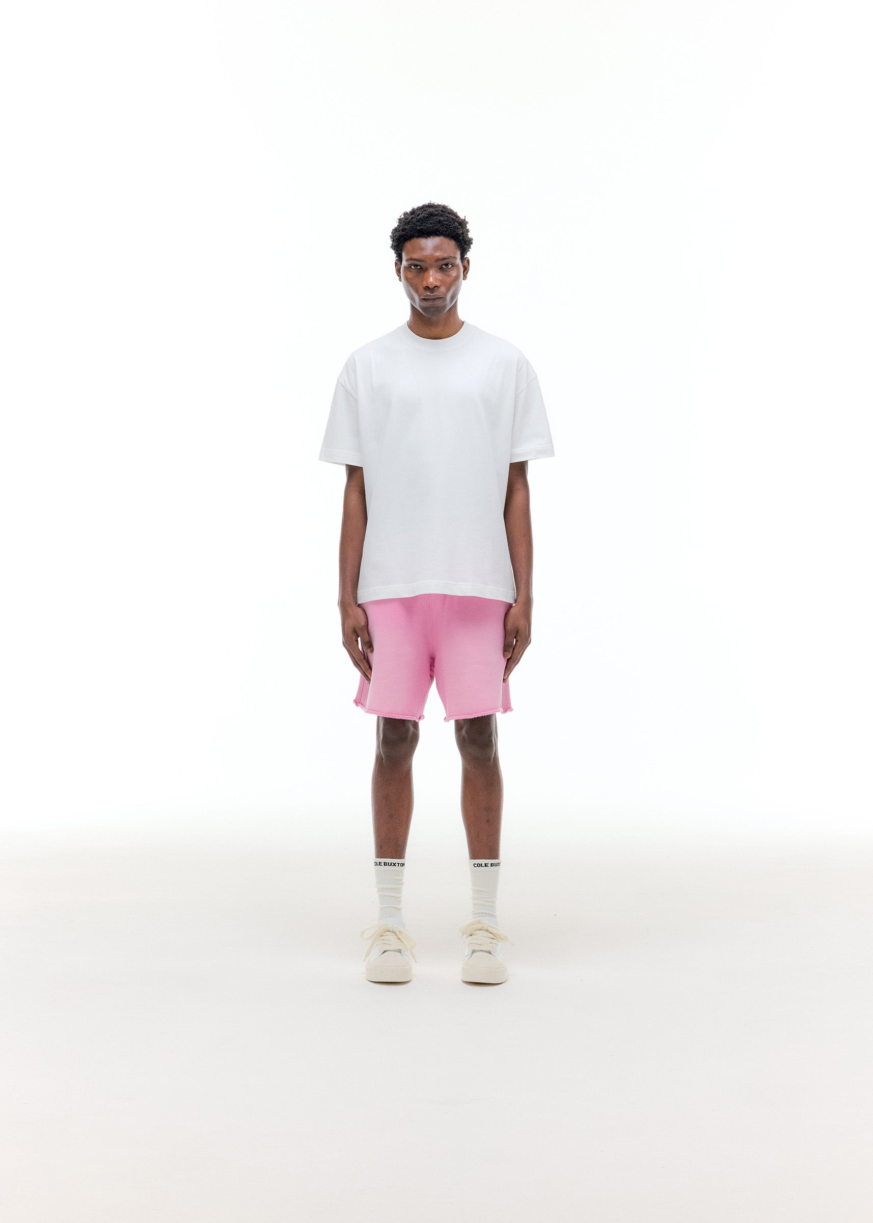 These sun fade shorts are brand new for ss25. We’ve developed a brand new 500gsm half brushed American fleece for this that’s heavy in weight yet has a luxury drape. The silhouette is boxy and old school and we have heavily washed this garment and treated it to achieve an authentic vintage sun fade.