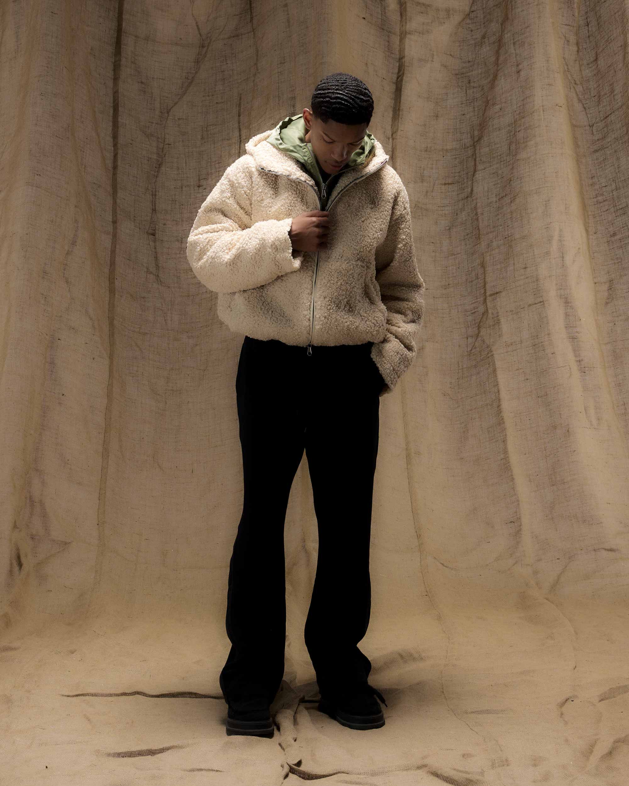 This zipped hooded fleece has been cut from a short pile curly wool sherpa with a soft backing. The silhouette is oversized with an adjustable elasticated hemline for cropping. Lined with an onion quilted primaloft insulation and finished with a CB branded 2-way zip.